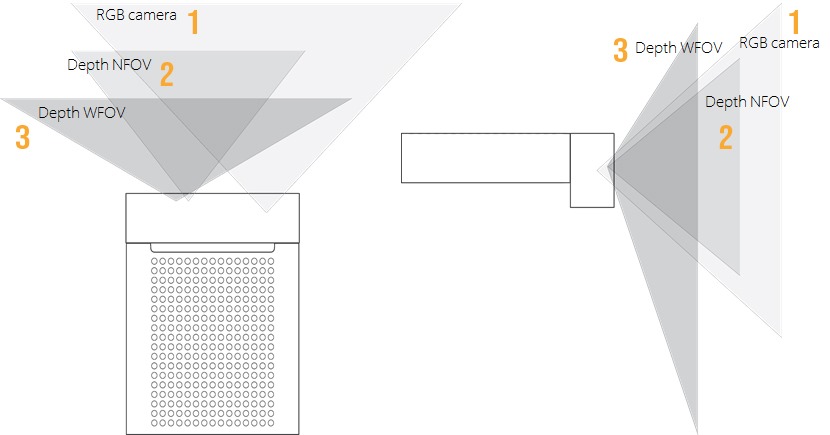 - NFOV (Narrow field-of-view): This modes are ideal for scenes with smaller extents in X and Y but larger in Z. One of the illuminators in this mode is aligned with the depth camera case, no tilted.