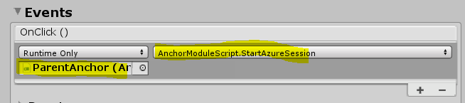 6. With the StartAzureSession button selected, drag the “Parent Anchor” Object to the “None(Object)” under the Runtime Only new row.