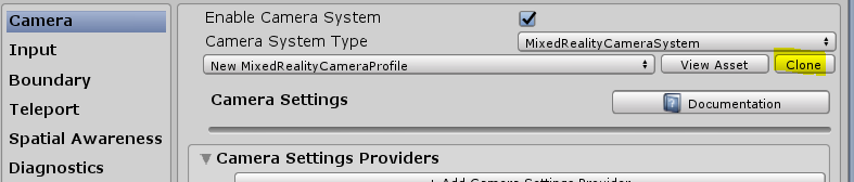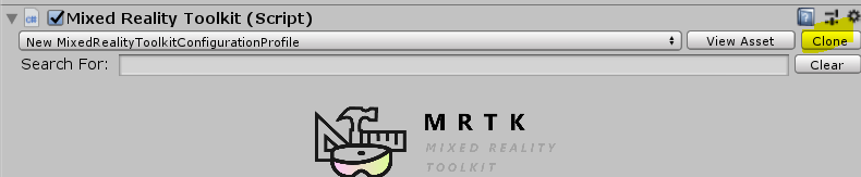 3. Select “Mixed Reality Toolkit” in your scene, go to Inspector and Clone configuration.