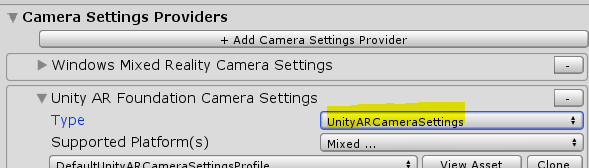 6. Under Type > Microsoft Mixed Reality Toolkit Experimental Unity AR > Unity AR Camera Settings