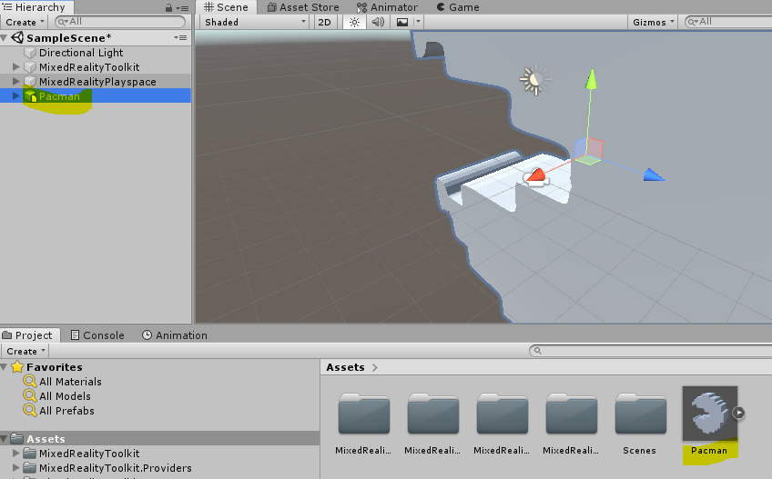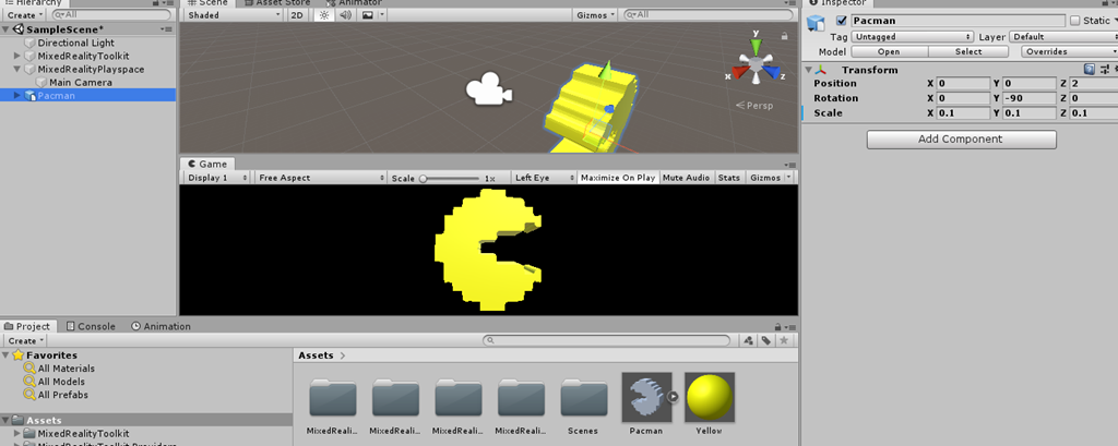 6 – Ok we set properties of the box, but we can not move it yet… so how do we manipulate it? We have to combine it with a Manipulation Handler (manipulationhandler.cs), for it to be manipulated. This handler supports both, one and two hand manipulation. So select Pacman in your scene and go to Inspector panel > Add Component > Manipulation Handler. Lets understand the properties we have in here.