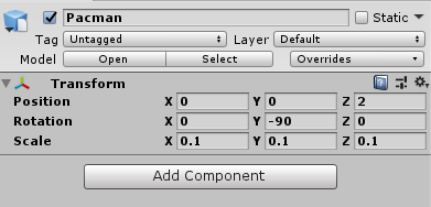 3 – Select the Pacman object in your scene, and go to Inspector you will change the values to the following.