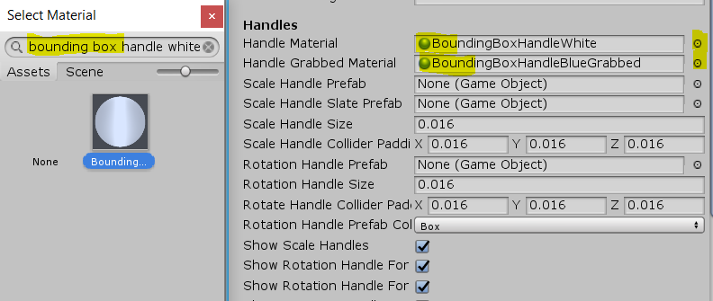 - If you want to apply the Hololens 2 style then click on the little dot located at the right of the Inspector Panel > Handle > Handle Material and search for two of the default materials like this.