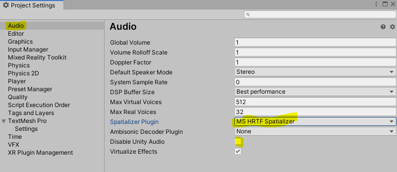 9. Select Audio – Uncheck “Disable Unity Audio” and select MS HRTF Spatializer under Spatializer Plugin.