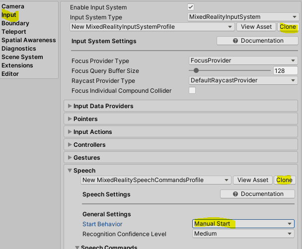 Select Input, clone the Profile and clone the Speech profile, then set Start Behavior to “Manual start”.