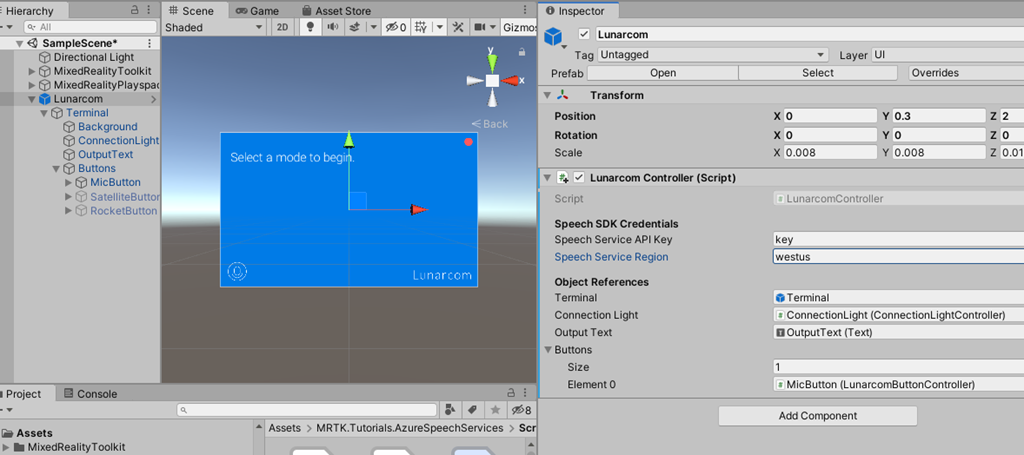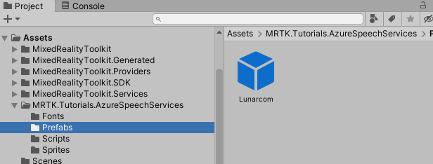 5. Select MRTK.Tutorials.AzureSpeechServices – prefabs – Lunarcom and drag it into your scene.