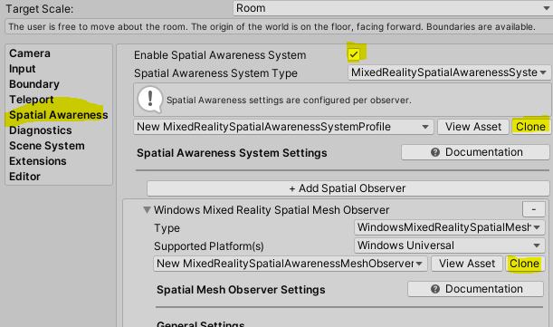 Select Spatial Awareness option and check the Enable Spatial Awareness System option. Then Clone the profile, open up the Windows mixed reality spatial mesh observer and also clone it.