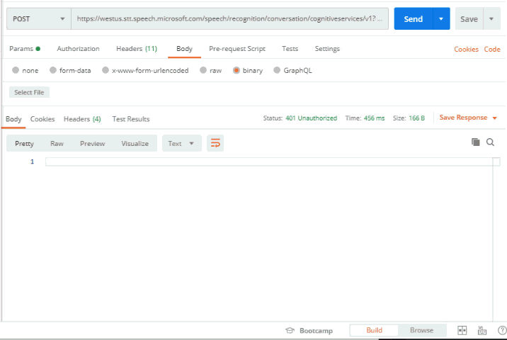 2. In the URL paste the following : https://REGION.stt.speech.microsoft.com/speech/recognition/conversation/cognitiveservices/v1? (make sure you update the region with the one provided by portal.azure.com )
