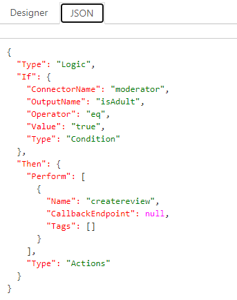 Microsoft provides a review tool. You can use this tool to create a new workflow and define an evaluation criteria and define actions accordingly. Workflows can be completely described as JSON strings, which makes them accessible programmatically as yo can see in the following image.