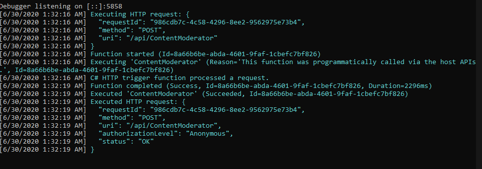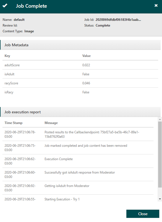 The job scans your content using the Content Moderator text moderation API and then checks it against the designated workflow. ased on the workflow results, it may or may not create a review for the content in the Review tool. While both reviews and workflows can be created and configured with their respective APIs, the job API allows you to obtain a detailed report of the entire process (which can be sent to a specified callback endpoint).