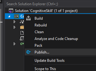 5. Now we have to publish our function to Azure. Right click your project and select Publish. Create a function in case you did not create it yet.