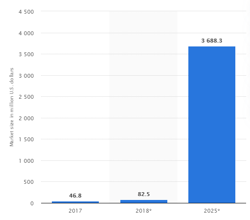 Mixed reality is gaining widespread recognition across business processes, and the momentum is expected to grow further. The following Statista report shows the mixed reality market size worldwide in 2017, 2018, and 2025. It is estimated that over this period the market will increase from roughly 47 million to about 3.7 billion U.S. dollars.