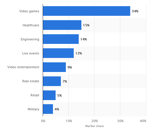 By that time, it is predicted that the video games segment will represent 34 percent of the augmented and mixed reality software market, which is forecast to reach 80 billion U.S. dollars that year.