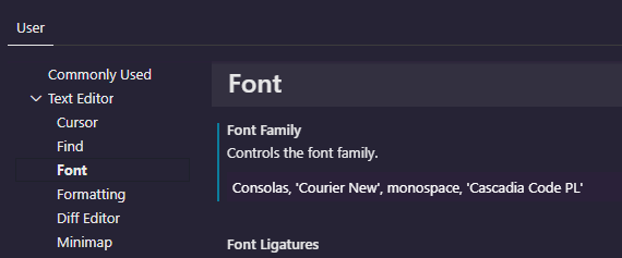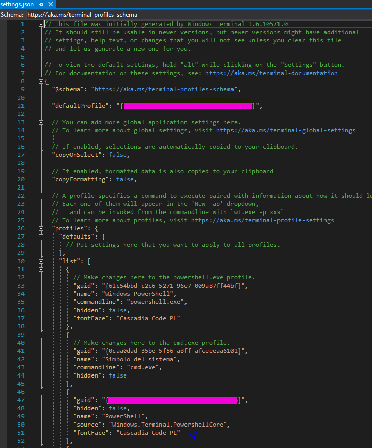“fontFace”: “Cascadia Code PL”