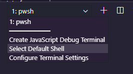 Now, to add it to visual studio code. Open VSCode, go to Terminal, new terminal then under the plus icon… select “Select Default Shell” and pick the one you want to use.