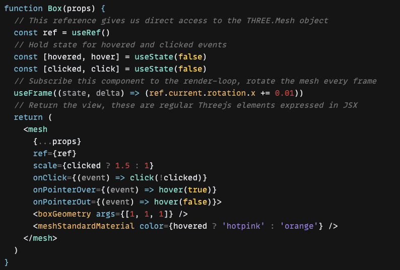 This means that we are able to create regular React components and let react-three-fiber handle converting those components into three.js primitives (3D objects). Components render outside of React. It outperforms Threejs in scale due to React's scheduling abilities.